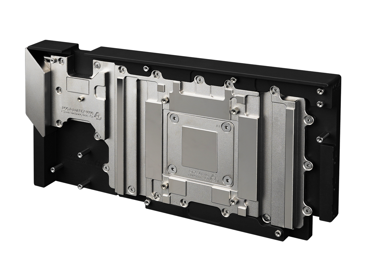 而在进出水口部分,这款 ROG Astral RTX 5090 冷头配备了一个平行六面体外观的黄铜模块,顶部和底部均配有一对 G1/4\" 螺纹接口,方便分体式水冷回路的自定义构建。