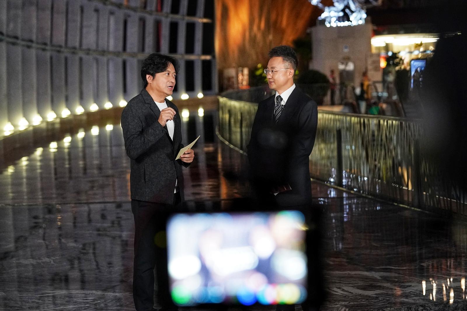 主持人刚强(右)、作曲家舒楠在直播导赏环节分析演出亮点。北京日报客户端记者 方非摄